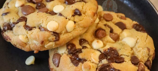 Thick and delicious pistachio NYC cookies stuffed with a homemade pistachio spread, dotted with white chocolate and chunks of pistachio. It was only a matter of time, right? I needed to post this recipe. I have made them countless times myself, and so many of my followers have already using my other recipes… they’re delicious!!…