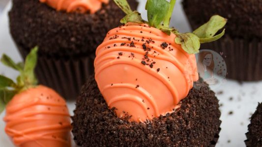 Cute and delicious chocolate cupcakes topped with a chocolate buttercream, oreo dirt, and chocolate coated strawberries for carrot patch cupcakes! Perfect for Easter.  As always we are way into Easter bakes now, and I have no plans on stopping any time soon… it’s still a month away, so I have plenty of time for more…