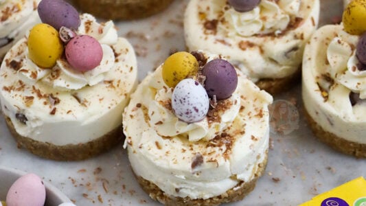 Individual mini egg cheesecakes with a buttery biscuit base, no-bake vanilla cheesecake mini egg stuffed filling, whipped cream and more!  Can we all appreciate for a minute just how cute these cheesecake are?! Little individual mini egg cheesecakes that are easy to serve, pretty, and of course… very very tasty.  Easter bakes As we all…
