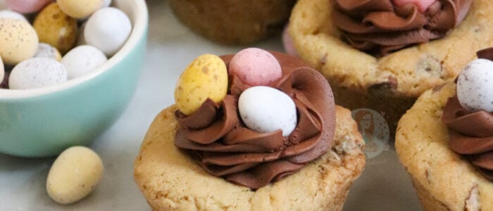 Mini egg cookie cups with chopped mini eggs, chocolate chips, and a whipped chocolate ganache topping… perfect for Easter!  I am slightly addicted to cookie bakes, can you all tell?! If not… where have you been! They are by far my favourite thing to bake at the moment, and when you add in a delicious…