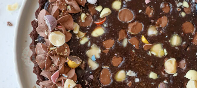 With a homemade chocolate pastry, thick chocolate filling and easter chocolates this easter chocolate tart is a showstopper for sure! I wanted to give you a recipe that was decadent, rich, but so easy to make at home. With various skills of a homemade chocolate shortcrust pastry, and a baked chocolate ganache tart filling it…