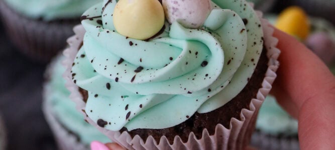 Chocolate and vanilla Easter speckle cupcakes with a chocolate sponge, and vanilla buttercream frosting with a chocolate speckle! A bake that I have wanted to post for a while, because it’s a classic, and it’s delicious and the amount of people who have asked for this is insane – they’re a cute and simple bake…