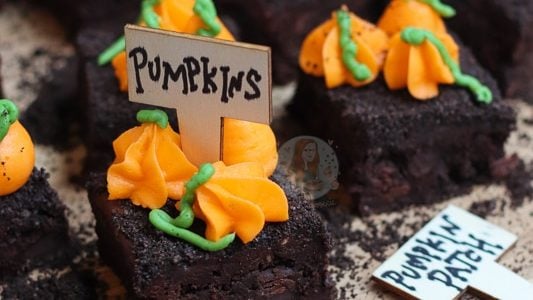 Rich gooey chocolate brownies, chocolate buttercream frosting, oreo dirt and buttercream pumpkins make the best pumpkin patch brownies ever!  Pumpkin patch brownies We are halfway through October, and I still have a good few bakes to come for spooky season… although, these pumpkin patch brownies aren’t necessarily spooky, they are cute and delicious instead. JUST…