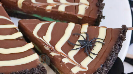 A delicious and spooky spider web tart with a biscuit base, slime mint filling, chocolate ganache and spider web… spooktacular.  Are you prepared to be terrified? Are you prepared to be grossed out? Are you prepared for something absolutely spooky… no? Well, what about something that isn’t spooky at all and really is just very…