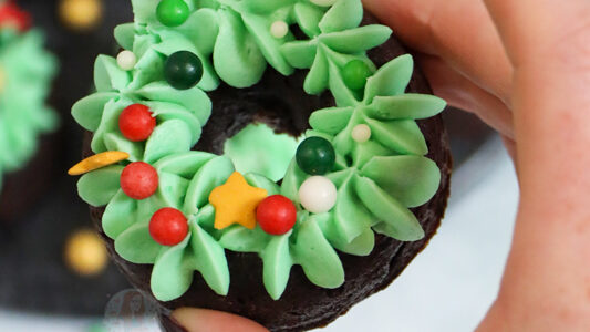 Delicious chocolate brownie doughnuts with chocolate chips, topped with green buttercream frosting and sprinkle baubles = christmas wreath bronuts!  Say hello to the cutest little edible Christmas wreaths you fill find this festive season! They are sweet, super chocolatey, and yes, they are brownie doughnuts. HELLO!! Brownies So we all know and love my brownie…