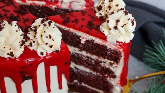 A deliciously festive red velvet drip cake with four layers of sponge, delicious frosting, ganache, and more! This beauty of a recipe is designed to give you all the festive vibes with its white and red theme, delicious flavour, and beautiful decoration. I am obsessed with all things red velvet, and after so many requests…