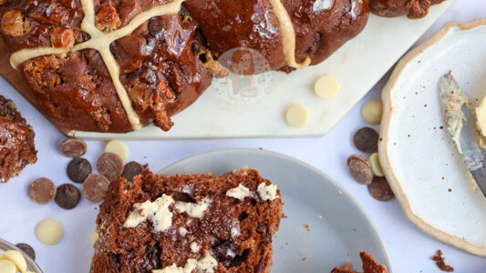 Delicious homemade chocolate hot cross buns with a chocolate dough filled with chocolate chips, perfect bake for Easter – and perfectly toasted and served with a little butter!  So.. bread… I love you. I love bread. Honestly, bread is one of my favourite things in the world! And if you make it chocolate based?! Oh…